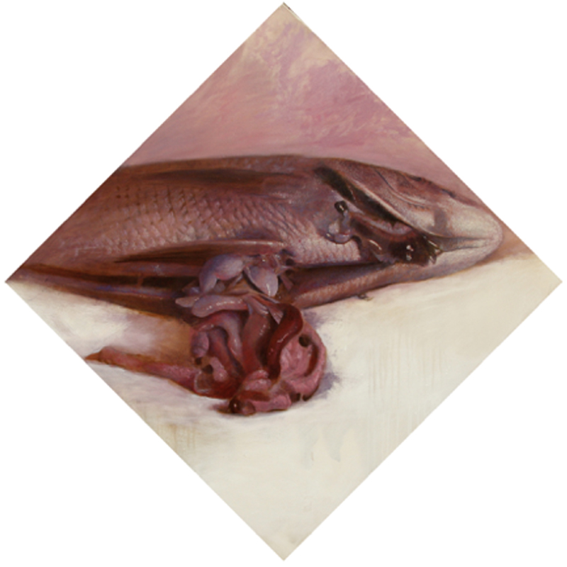 台灣的海島地形造成飲食文化的獨特性,「現撈現撈」也成為漁港中攤販最長宣傳自己的一句話,而要吃到更新鮮的海產就會把他先養在玻璃缸裡,等有顧客要買再現殺,最好的鮮魚料理要在於還沒死之前把魚料理好,端上桌享用。創作者站在一個提問者的角度,審視這樣的文化,運用寫實的手法刻畫描繪出物體的表象,以甜美顏色氣氛去覆蓋住那血腥題材的感覺形成形式上的衝突,也凸顯出對生命的一種態度。
