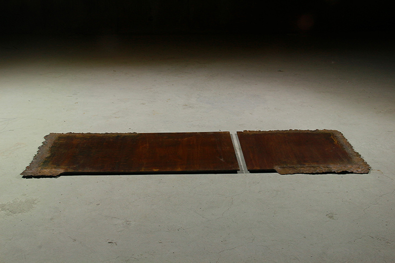 透過材質本身的特性,在板子上不斷地敲打使之越來越薄,可以清楚的看到板子本身的厚度與邊緣由機器裁切下筆直的線條的差異。藝術家透過勞動者的角色對照機器的角色,以不斷重複的相同動作,探討行為、身體與材質的對話。