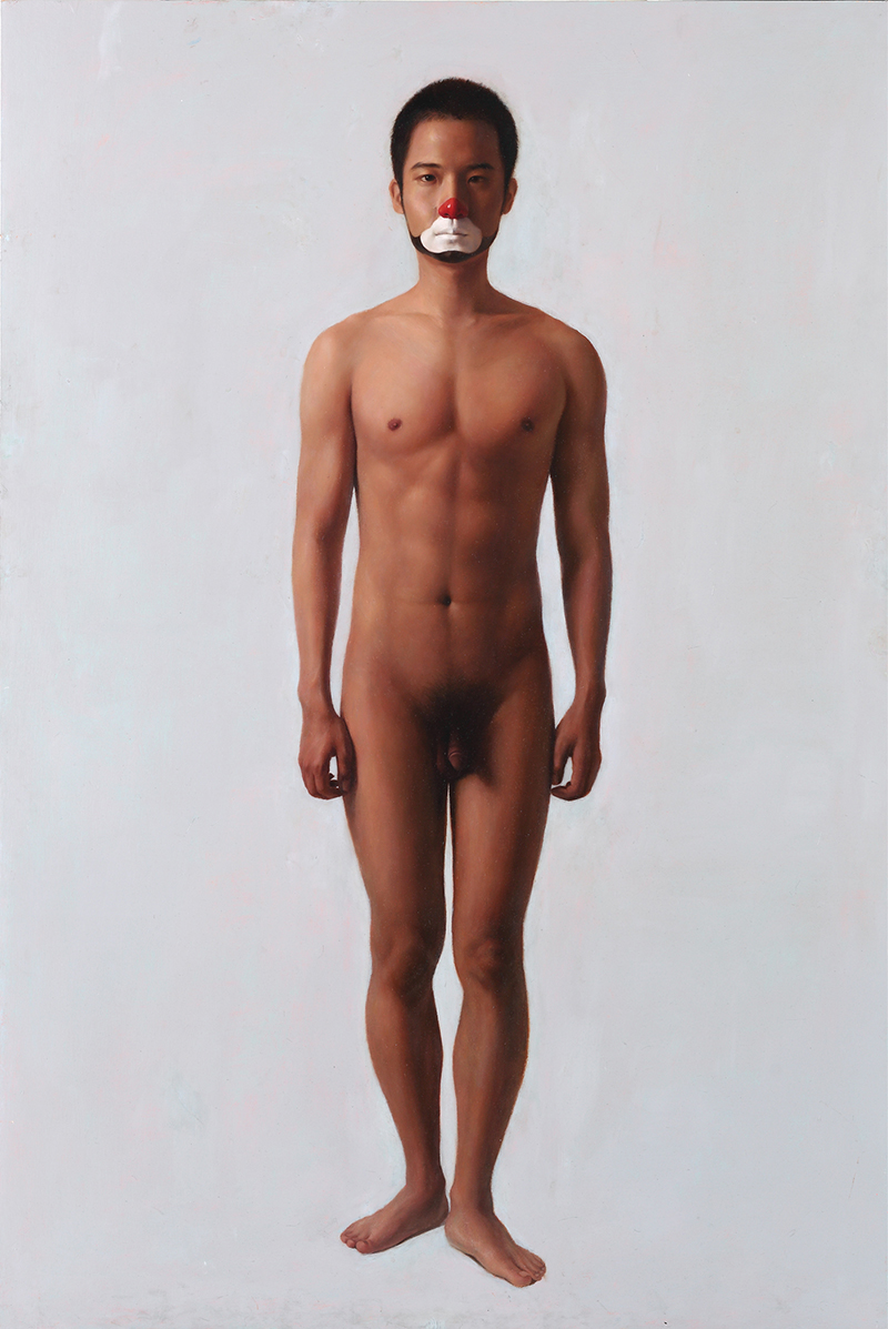 創作者以自身為畫作的主角,透過攝影攫取了當下全裸,畫上了小丑臉妝的影像,以超寫實的手法轉化內在自省的觀察。