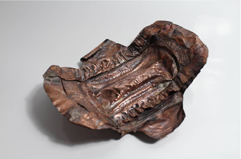 衛生棉意味著女性的初熟,將看似柔弱又舒服的貼身用品,以金屬堅硬的材質來表現,象徵著女性容忍生理上的不適,外在卻仍維持靜謐的形象。
