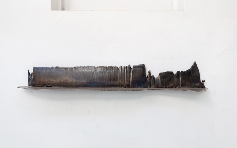 我創作的要素為金屬與在地文化的關連性,以及如何表現金屬的材質特性。在長時間切割鋼材的作業中,深化了對金屬的認識與溝通,透過金屬加工的過程,將「能量」轉換為造型的趣味性。在造形領域中「材質」可分為物質性與非物質性,我經由這兩種特性表現雕塑與環境的關係。此次鋼鐵風景中的《山水系列》是透過溫度、 火焰、動態切割鐵板所得到的雕塑原型。利用高溫穿透過鋼鐵的表皮,讓溫度在厚鋼材的內部累積、流竄與爆裂。鐵水有如岩漿一般擠壓地表形成紋理,當溫度持續上升在鋼鐵內部累積後,滾燙的鐵水滿載著能量,溫度讓鐵回歸到最原始的物質性,也讓我體會到「火」是所有非物質性材質中最原始且最具有能量的要素。