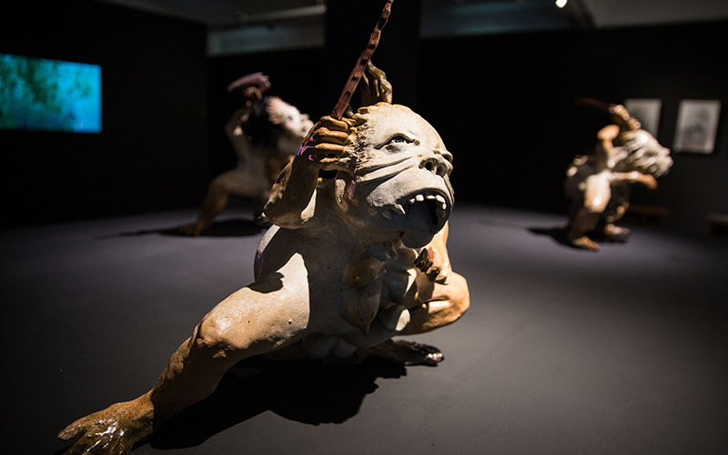 在台灣居住多年的馬來西亞藝術家杜爾,對於自身的身分認同與族群、宗教之間的暴力與衝突有相 當深刻的體會。〈Pahlawan〉系列的陶製雕塑,揉合了民間信仰和宗教神話,以張牙舞爪的戰士形象,配合馬來西亞的傳統武器,思考武力和信仰之間的彼此關係,在古典和當代藝術中做出連接的橋樑,也對於近年盛行的「恐怖主義」提出質疑和反省。