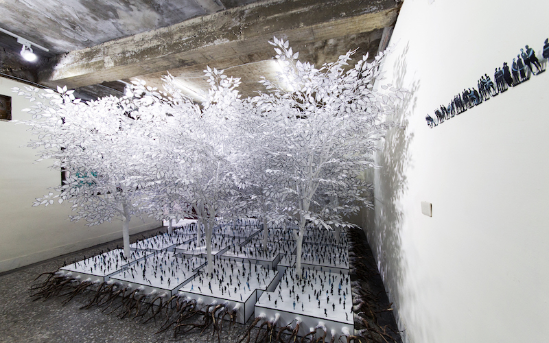 用白色顏料塗染象徵土地的幾何體塊,改變自然的真實而形成視覺上的蒼白、冷漠、疏離、機械之感。以具有病態之美的人工形態反映出人對自然、生態的過度干預與操縱所形成的畸形意識與冷漠情態!具有自然生命力的、延伸於土地之中的樹根與人工形態的樹幹、樹冠形成強烈對比,作品具有強烈的批判意識,是針對現今人類共同面臨的生態問題的提出與揭示,共同解决人類同樣面臨的問題。 作品整體運用現成材料進行拼接、裝置處理, 又將中國畫中的線描、墨染等技法技巧介入其中,形成獨特的、異樣的視覺效果,在加強對作品主題的傳遞與表達的同時,也是對當代裝置藝術語言與中國傳統書畫的技法技巧在藝術上的綜合運用的自我挑戰與嘗試。