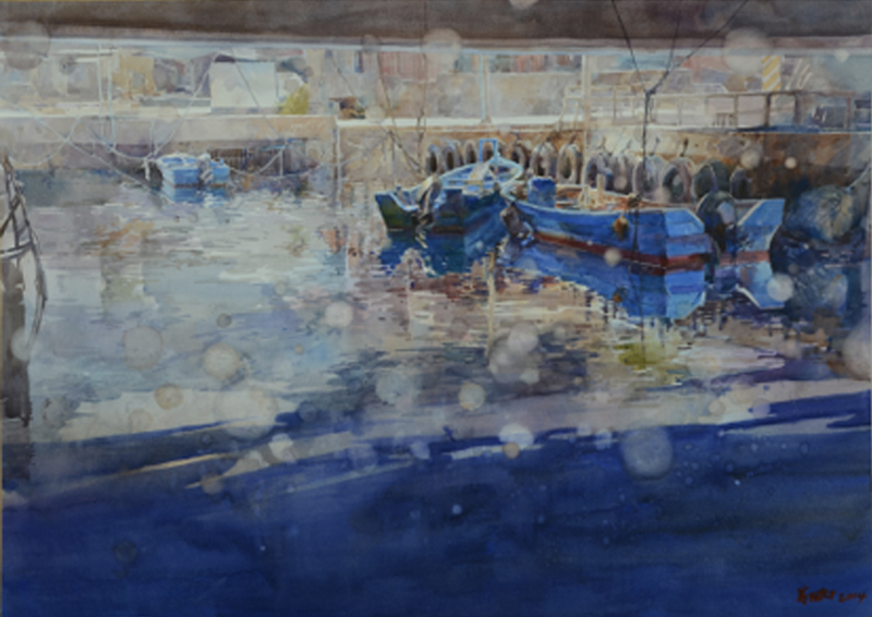 風景的背後,都有其所蘊藏的意義,在這件作品中,則是創作者少時成長的深沉記憶。創作者將這系列的畫面處理,刻意加入有如失焦的塵埃般,橫亙畫面之中,藉此部份效果表現出距離感及產生無法看清,好似被洗去記憶般的心理效果。構圖方面也是刻意將物件安排在畫面一邊,再利用色塊、面積、比例及對比的方式來求取平衡。藍色的冷調性是主色調,加入溫暖的赭色調來調合畫面。光的表現則是視畫面需要加以強化或消弱,利用天空倒影及橋墩的陰影所形成的色域來表現出畫面外的空間關係,並凸顯出逆光的顏色質感,讓這張作品創造出一種具有思想性及詩性的畫面表現,來與觀者互動。