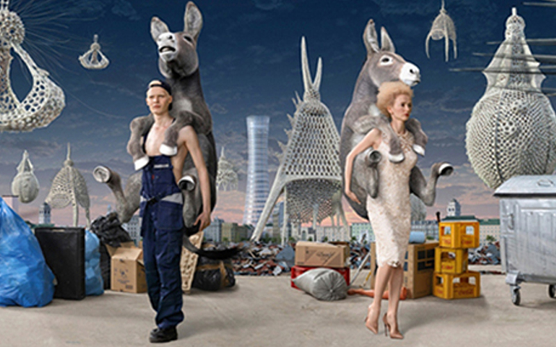 「顛倒世界」以中世紀嘉年華荒謬場景隱喻當代生活的片段,人物從荒誕的社會烏托邦場景出場並交換面具,從乞丐變成富人、從警察變身小偷。都會美男的街道清道夫以垃圾洗滌城市, 女檢察官在 IKEA 式結構體上折磨男性,小孩與老人在打跆拳賽。「顛倒世界」是將奇想怪獸視為寵物、將末日當成娛樂的世界。