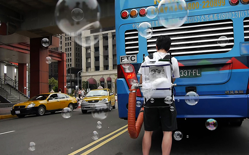 在這個行動紀錄裡,我製作一個利用汽車排氣來驅動的泡泡機,目標是要把一輛輛載著乘客的公車變成了靠著廢氣運轉的行動泡泡機,透過車輛在城市中的來回穿梭、摩擦出一個包覆著骯髒空氣的美麗假想。就如同充斥著我們日常生活的其它事物一般,我樂觀地將這不完美轉化、粉飾成為一場夢幻的街頭泡泡秀,同時透過這個象徵性的對比在提問著,我們眼前這個被漂亮說詞所包覆的當代生活背後,到底是什麼在塑造和驅動著我們的生活?而我們是否還有能力去想像,甚至創造自己與這些生活系統的關係。