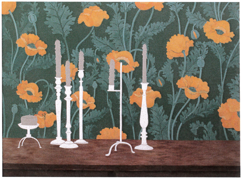 《生活況味》隱喻生命中時間的流逝,以筆者所收藏的燭台轉化成簡鍊的造形及色塊,用最簡單的形式來傳達最豐富的精神內涵,透露著生活軌跡,曾經輝煌過的痕跡依舊鮮明,在歲月堆疊下反顯其古樸、恆久。背景以大自然中綻放並散發出芳香和展露出美態的花朵來隱喻生命的短暫。