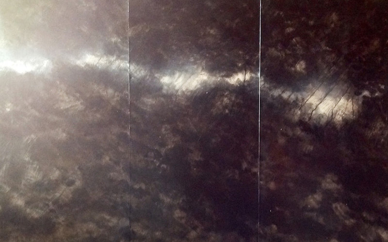 這是一件雙面繪畫的裝置作品,邀請觀眾繞行屏風去感受影像的雙重維度,從中開啟「之間」(in-betweenness),一種觀者和世界去相合的關係。