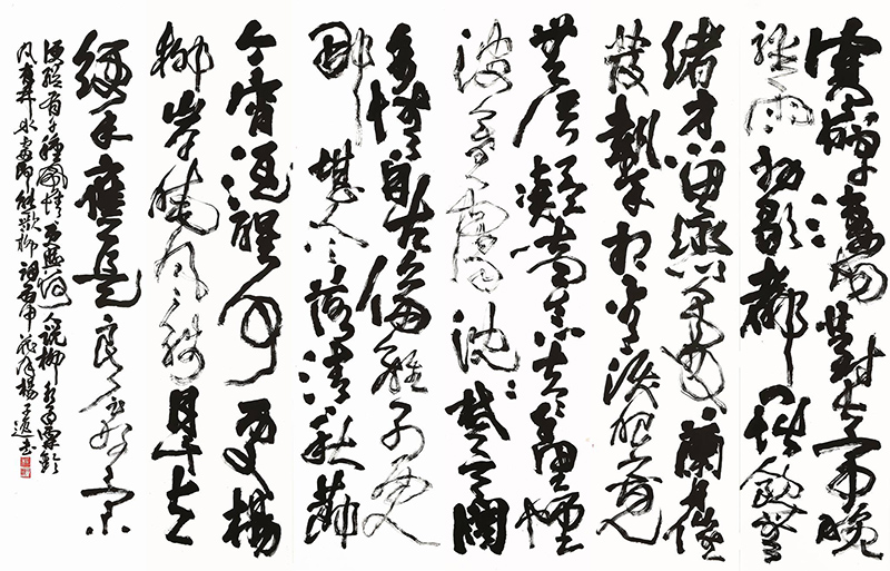 〈柳詞〉為雨聲書作系列的第三件作品。創作者對書寫的體會,在線條與線質間達到一超群而難以取代的流動及靈活,獨有的文字造型發展使得書法藝術能傳達靜中有動且富有生命力的美。下雨天之於創作者,彷彿身處獨立而無我的場域,隨著雨聲,靜靜地以心眼觀察外在,體會自然及宇宙發展行進的「道」。