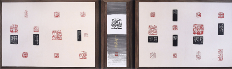 創作者以蘇軾《水調歌頭》一句一印為創作主題,採雄渾有力的印風,參以吳昌碩、虞山派等的大家的風格,將心境配合句意融入而成;題款形式以墨寫印為款,名字以金泥書寫置中,搭配淡墨與白文「陽」印,四色的相互搭配創出新意。